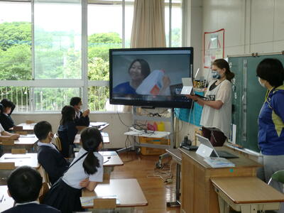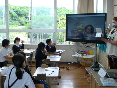 英語専科の先生が、ご主人の実家のアメリカに一時帰国しています。今日は、その実家とオンラインで結んで外国語の授業。暮らしや、文化に触れながら、これまで学んだフレーズなどを使って勉強しました。