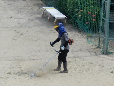 運動会へ向けてグラウンドの整備を主事さんが行ってくれています。草刈り機で、草を根っこごと刈り払って又はえてこないよう整備されています。