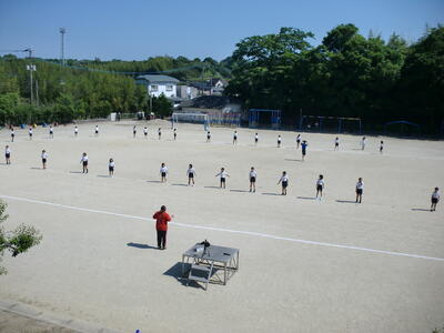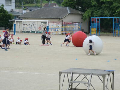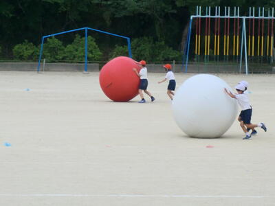 2,3年生の団体、大玉転がしの練習です。コツをつかむと速く転がせます。