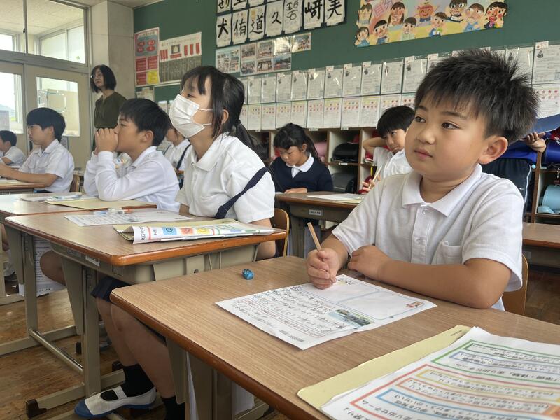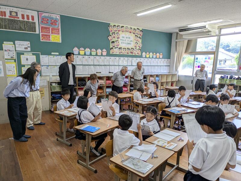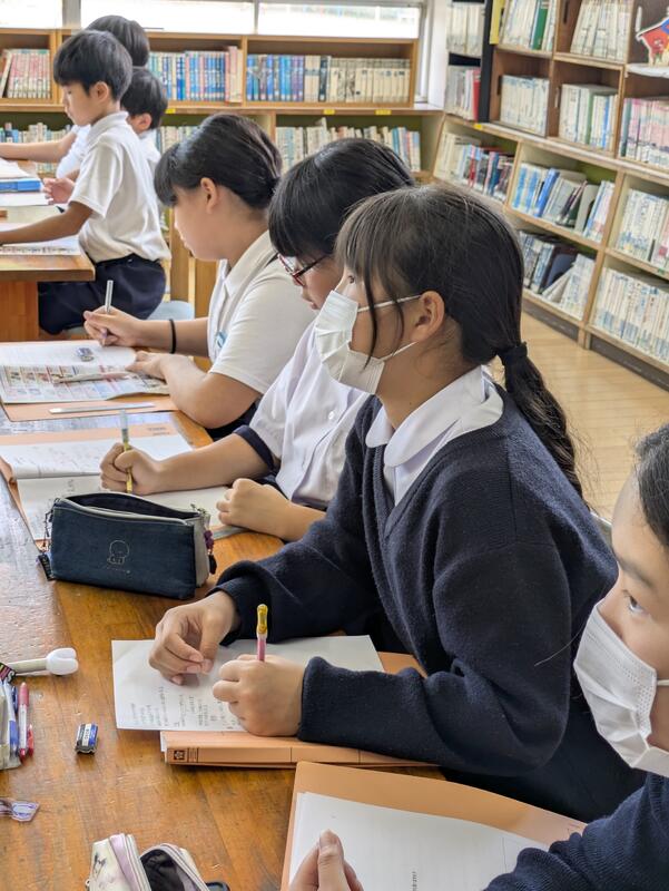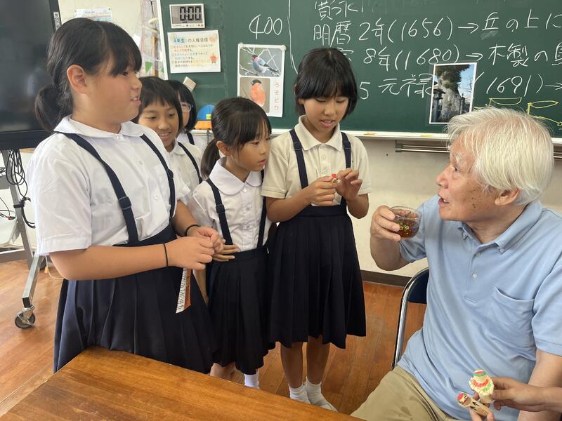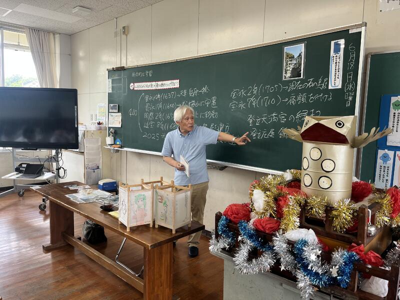 4年生は総合的な学習の時間で地域活性化の取組について学習を進めています。天満宮の歴史を掘り起こし、そとて地域の文化に触れながら学びを深めています。今回は地元の歴史に詳しい山川さんを講師にお迎えして、天満宮の由来と伝統玩具「うそ」についてお話しいただきました。学びを地域活性化「夏祭りをもりあげよう」につなげるために真剣な学習を重ねている4年生です。