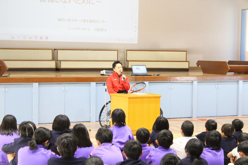 今日はお客様がありました。車いすテニス パラリンピック(リオ・ロンドン)日本代表の川野将太さんをお迎えし、「挑戦~後悔しないために」と題してご講演をいただきました。「車いすテニス」との出会い、障害をもつことへの考え方、自分を支えてくださっている方々への感謝の念、生き方や考え方について語っていただきました。「夢実現の一番大切な要素、それは感謝の気持ちを忘れないこと」と、のびっ子たちに強く伝えられました。また、「失ったものを数えるよりも、残ったものを最大限に使う」という常に前を向き、歩み続ける考え方も教えていただきました。のびっ子の心に勇気とやる気、そして、優しさを湧き上がらせていただいた時間となりました。川野さんのご活躍を全員で応援していきます。