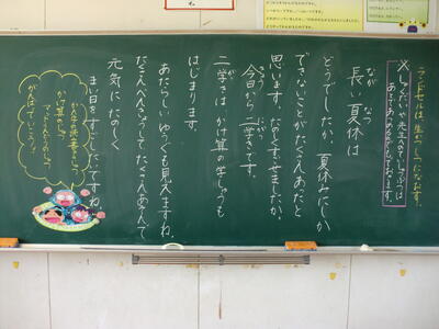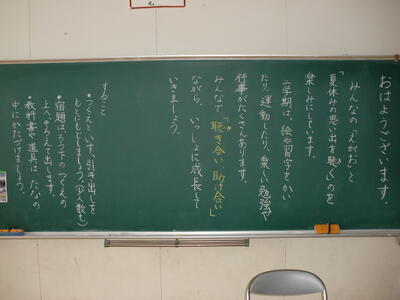 各学級では、子供たちを迎える黒板メッセージ、アートが描かれていました。