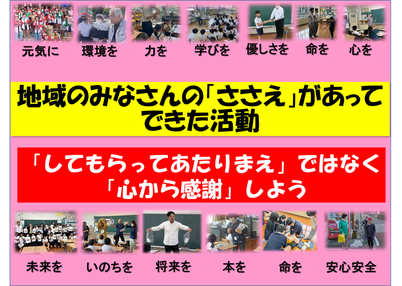 今日は、校内持久走大会を実施しました。1、2年生は1.2㎞(2000歩)、3.4年生は、2.3㎞(3000歩)5.6年生は、3.4㎞(3500歩)の自分への挑戦でした。応援する人たちも、気持ちを向け、声を向け、目を向けて、しっかりと温かい言葉をかけていました。また、保護者の方々、地域の方々からの応援から、それぞれの思いが届き、勇気と元気をいただきながら道のりを進み、完走したのびっ子たちでした。心と体もポッカポッカの、のびっ子たちでした。