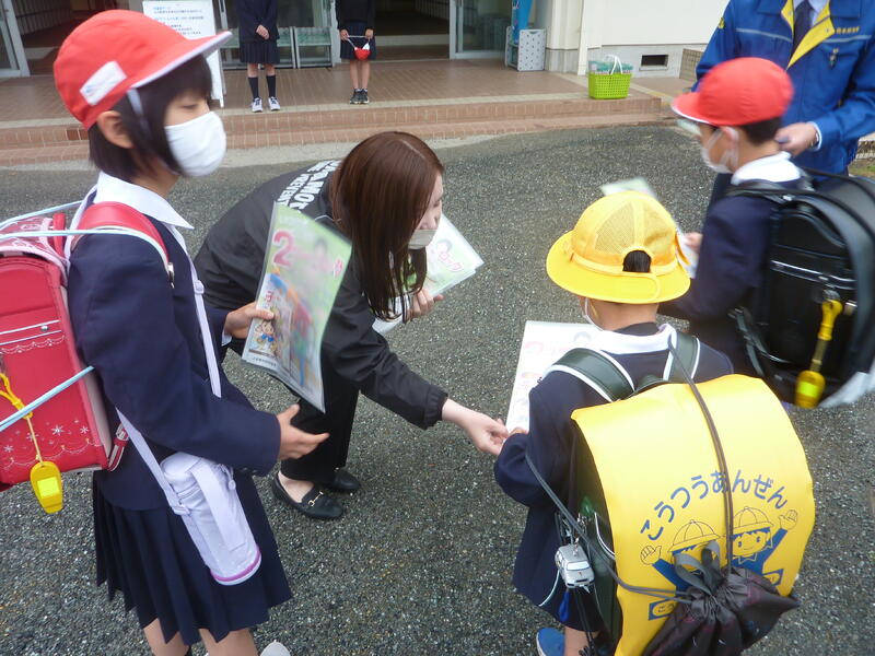 また、今朝は上天草警察署から来校され、防犯啓発の呼びかけがありました。併せて防犯に関するハンドブックや記念ポーチの配付があり、いつもと違った雰囲気で一日をスタートしました。