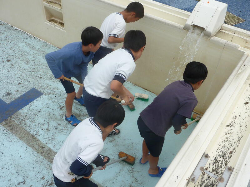 やっと晴れた今日は、のびのびになっていたプール掃除を行いました。4年生以上の子供たちで、役割分担を決め、活動時間も分散しながら取り組みました。「プール開きが無事にできますように!」「水泳の力が伸びますように!」と思いを込めて、下級生の分まで力いっぱいに活動しました。来週はプール開きです。いよいよプールシーズンの到来です。