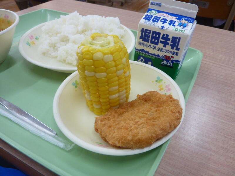 今日の給食は「カツカレー」でした。こんがり揚がったトンカツと具だくさんのカレーが並びました。そしてもう一つ。トウモロコシが副菜としてつきました。このトウモロコシは、地元の農家さんから供給していただいたもので、朝の時間に一年生が皮むきをしてくれたものです。自分たちも給食に関わる体験をした子供たちは、いつも以上においしそうに給食をいただいていました。関わっていただいた方々に心より感謝いたします。