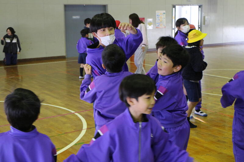 〇体育館での交流活動の様子です。学校生活の〇×クイズ、グループづくり活動。6年生との交流も深まりました。〇運動場ではドッチボール、鬼ごっこを楽しみました。