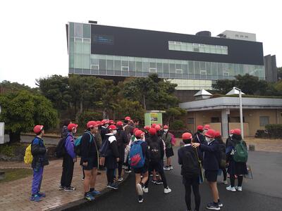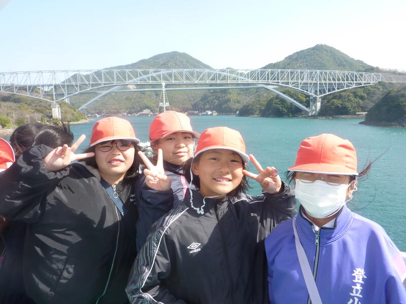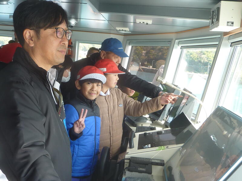 4年生が乗船体験活動に参加しました。今回の活動は、熊本県海運組合上天草市海運業次世代人材育成推進協議会様のご厚意により、実現したものです。天候にも恵まれました。進水したばかりの貨物船 第三舛宝山丸(舛宝海運)に乗船させていただきました。船内では、海運組合の方々のナビゲーションで船内の探索、そして航海を体験させていただきました。のびっ子たちは大興奮でした。船内はほとんどがオートメーション化されいて、驚きの連続でした。操舵室にも入れていただき、舵に触れることもできました。また船倉の広さにびっくりしました。サッカーもできるほどの空間がありました。今日の体験で海運業への理解と憧れをもったのびっ子たちでした。ご協力いただいた熊本県海運組合様、舛宝海運様に心より感謝申し上げます。