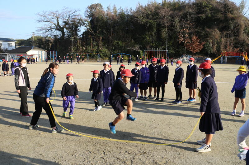 のびっ子は朝から元気いっぱいです。今朝は長縄に全員で取り組みました。縦割り班ごとに回数を競い合います。気温が低かったのですが、キラキラ輝く太陽と笑顔で、心も体もポカポカになりました。