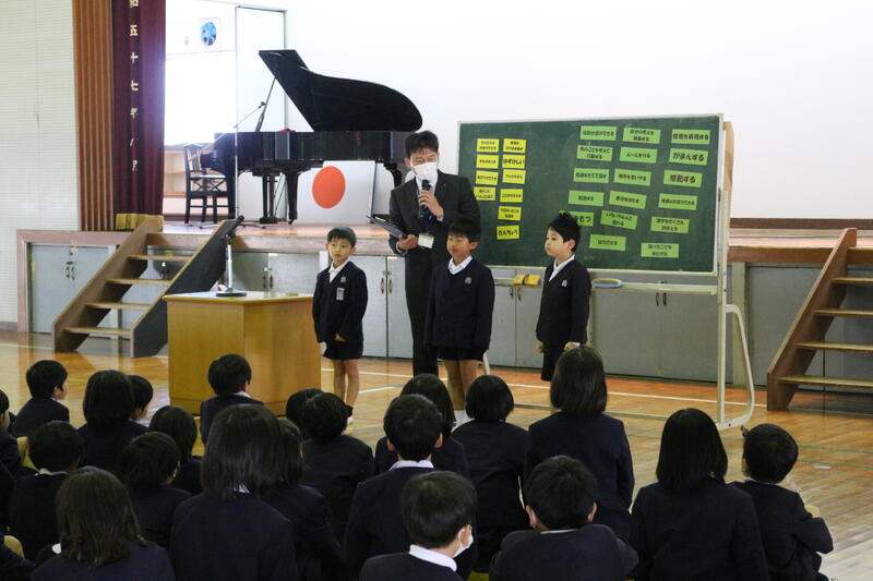 今日は、児童集会を開きました。「命の集会」と題して、保健委員会のみなさんが、絵本「ええところ」の読み聞かせをしてくれました。その後は教室に戻って、学級の友だちの「ええところ(よさ)」について伝え合ったのびっ子たちでした。また、集会では、おにぎり給食での「おにぎりグランプリ」の表彰もありました。