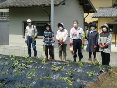 四郎丸の甲崎さんはじめ、5名の地域の方々にご協力頂き、1,2年生がいも植を体験しました。これから、育って秋に大きな芋が収穫できるよう、水やりや草取りも頑張っていこうと思っています。