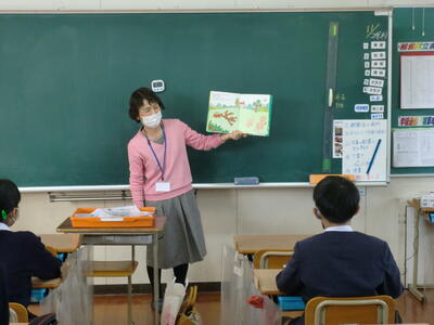 11月の読み聞かせ 投稿日時 : 2022/11/24 学校サイト管理者 今学期3回目の読み聞かせです。子供たちも、楽しみにしています。 1年生 松尾佳代先生 「てんつくサーカス」「ずっとずっといっしょだよ」 2年生 直江幸子さん(熊日童話会) 「どろぼう学校」 3年生 中野校長先生 「ええことするのは ええもんや!」 4年生 愛甲郁子さん(熊日童話会) 「六さんと九官鳥」 5年生 渡邊晶子先生 「こんなおおきなかず みたことある?」 6年生 橋本美春さん(熊日童話会) 「ぶたのたね」 Tweet