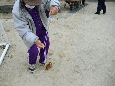 昔遊び 竹馬やこま回し 老人会の方々が教えてくださいました。