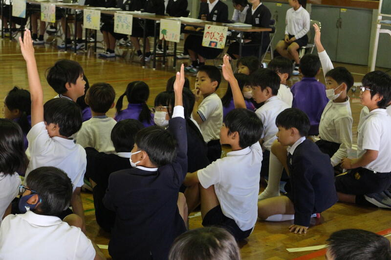 のびっ子167人が一堂に会して、児童集会「のびっこ子供会議」を開催しました。「よりよい学校生活を、すすんで、自分で、自分たちで」と、みんなで考える集会活動です。会議の初めには、運動会のスローガンの発表もありました。会議では、各委員会の年間計画の紹介があり、その内容に、たくさんののびっ子が質問や感想を出し合っていました。一年生が「どうして勉強をするんですか?」という質問にも、「夢を叶えるためです!」と、笑顔で答えるの6年生の姿がありました。もっともっと時間が欲しいと感じた集会でした。