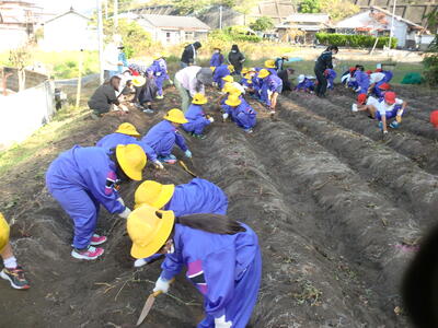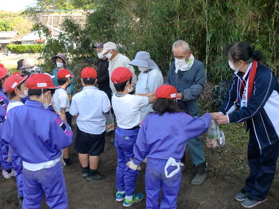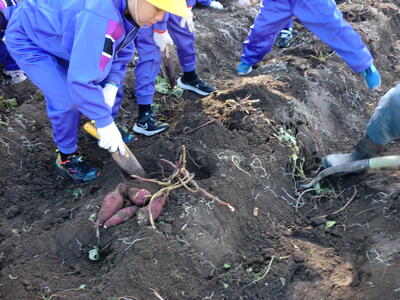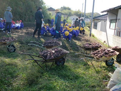 芋ほり 今年は豊作 投稿日時 : 2022/11/14 学校サイト管理者 1,2年生が1学期に植えた芋が成長し、芋ほりを行いました。昨年度は、天候不順のため小さく量も少なかったのですが、今年は、大きな芋がたくさんとれました。子供たちも、大喜びとびっくりで、感想にも「去年は少しだったけど、今年は大きいのがいっぱいとれてよかったです。」と言っていました。四郎丸の地域の方々、お世話有難うございました。 お互いに掘った芋を見せ合っています。 一輪車に、7杯分いっぱいの芋です。 最後に、お世話になった地域の方々に、花の苗と、きょう堀った芋を渡して感謝の意を表しました。 Tweet