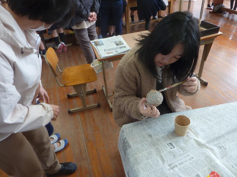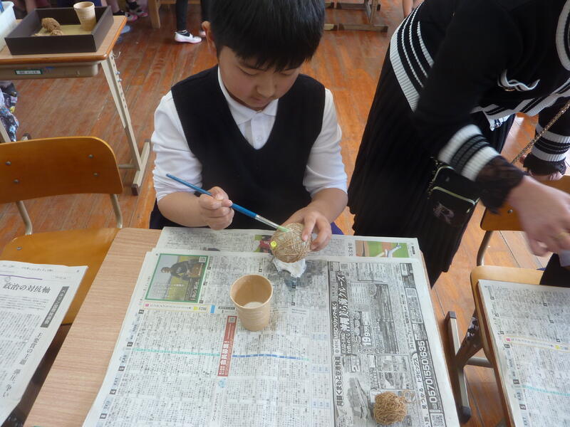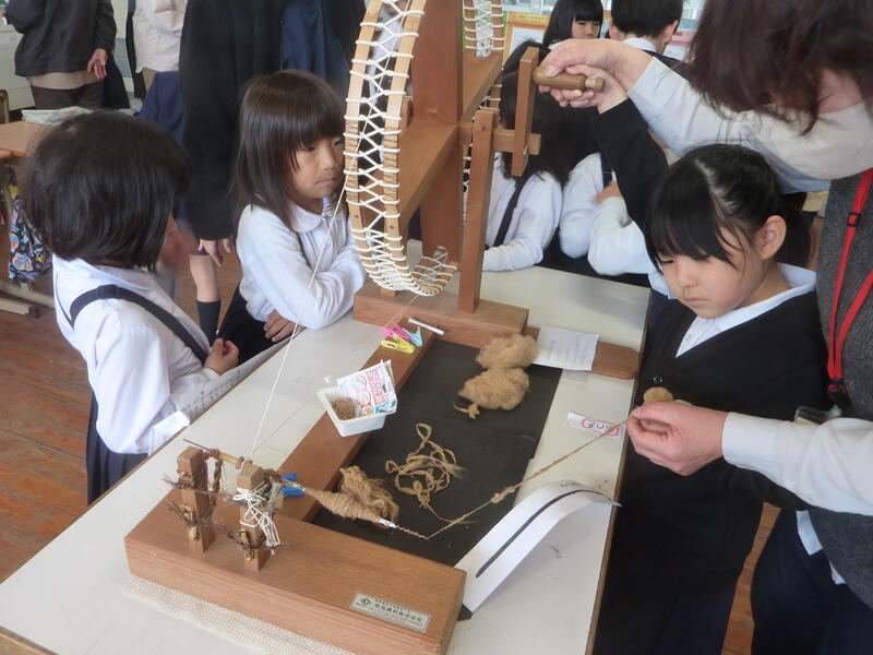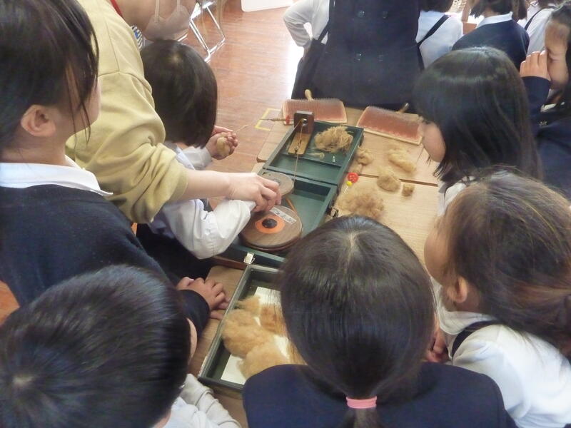 先日の活動に続き、糸づくりに挑戦したのびっ子たちです。ふかふかの綿を糸車を使って糸に加工していきます。切れることもなく、一本の丈夫な糸が出来上がりました。紡いだ糸は風船に巻き付け、オブジェを作りました。ご指導いただいた「どんぐり村」の方々には大変お世話になりました。この活動がこれからも続き、互いの絆が深まることを願います。