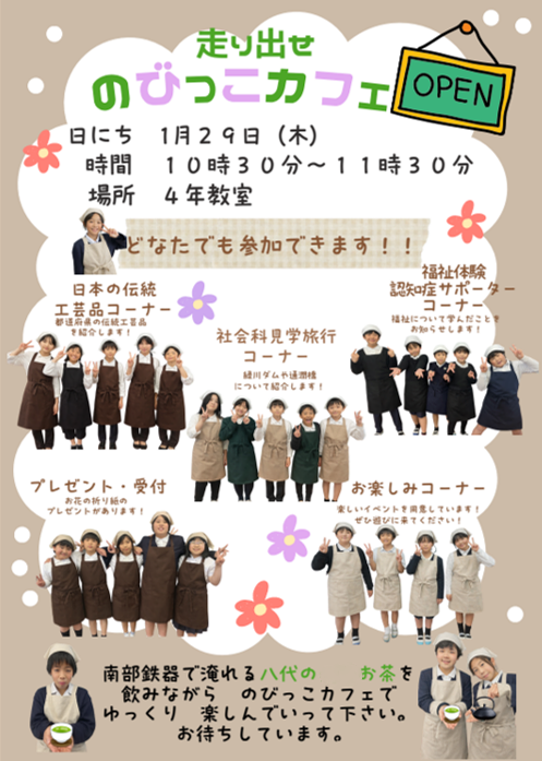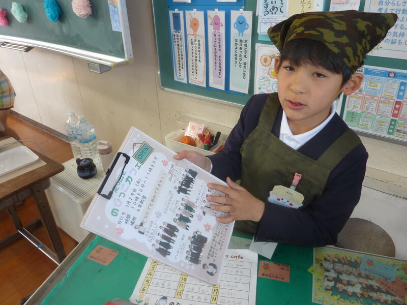今日は教室が学習カフェに変身しました。4年生が多くの方々を招いて学習成果を発表しました。鉄器で沸かしたお湯で淹れた特製のお茶も振舞われました。地域の方々、保護者のみなさん、そして、他学年の子供たちも参加し、賑やかな会場になりました。なによりも学習成果のまとめ方、プレゼンの方法もよく工夫されていて、参加された全員が満足のいく時間を過ごせたように感じました。のびっ子の学びがまた広がりました。