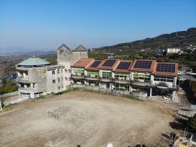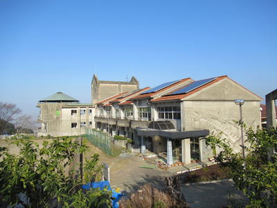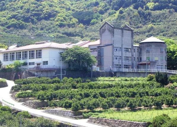 学校の周りにはミカン畑が広がり、春はミカンの花が咲き誇り何とも言えない甘い香りを漂わせます。自然豊かな環境の中、まるい特別教室棟が印象的な、「天空の城」というイメージの小学校です。