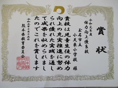 小天東小学校では、毎週火曜~金曜、伝統の朝のランニングタイムを実施し、体力の向上を図っています。今年度も10月15日に、熊本県教育委員会から体力向上優良校の表彰を受け、12年連続の受賞となりました。これから寒い時期になりますが、閉校まで残り4ヶ月、これまでの卒業生も続けてこられた頑張りを最後まで引継ぎ、やり遂げたいと思います。