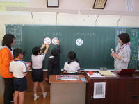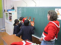 今日は、子ども達が大好きなALTのモーガン先生が来られました。月に1~2回のALTとの学習をとても楽しみにしており、今回は、クリスマスの格好をして、トナカイの「福笑い」のゲームなどにチャレンジしていていました。トナカイの鼻の位置を教えるのに、周りの子たちが「right」「left」「turn」などを使って上手に教えており、英語を使ったコミュニケーションにも関心が高まっているようです。