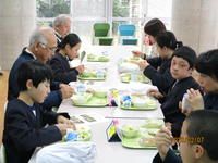 今年は、授業等でお世話になった地域の方々を招待して、「地域感謝の会」を開きました。まず、昔遊びで交流を行いましたが、地域の方の技も「さすが」の一言で、子ども達は、コマ回しやお手玉などのコツを嬉しそうに教えてもらっていました。その後、ランチルームに移動し、感謝のメダルを渡して、給食での会食を楽しみました。