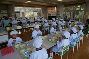 小天東小学校では、全校児童がそろってランチルームで給食を食べます。全学年の子どもたちがそろうので、お互いの顔を見ながら、楽しく給食を食べることができます。他学年が授業で遅れた場合などは、早く来た学年が準備をするなど、助け合う場面も見られます。 | |