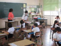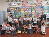 生活科の時間に地域学校協働活動推進員の水本先生においでいただき、ハロウィンの飾りづくりを行いました。はじめにハロウィンの絵本の読み聞かせをしてもらった後、水本先生の家でとれたカボチャを使い飾りを作りました。みんな楽しそうに作っていました。