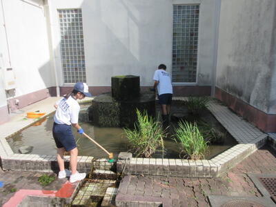 天水中から職場体験で本校の卒業生、3年生の上野君と村上さんが来ました。午前中は低学年の授業に入り、授業のお手伝いをしました。午後からは、4時間授業で子どもたちがいませんでしたので、環境整備で池の掃除を頑張ってくれました。職場体験は、明日までです。