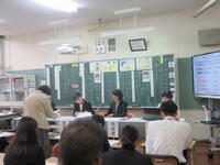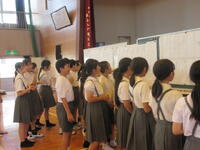 午後から玉名市人権学習授業実践交流会があり、本校の2年生が授業を行い、20名以上の先生たちがおいでになりました。「人によって態度をかえない」ことをねらいとした学習でした。教材を使って学習したことから自分たちのことへと結びつけて考えることができました。授業研究会では、自分たちのことを真剣に考える子どもたちの姿をたくさんほめていただきました。