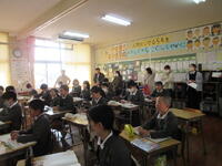 午後から玉名市人権学習授業実践交流会があり、本校の2年生が授業を行い、20名以上の先生たちがおいでになりました。「人によって態度をかえない」ことをねらいとした学習でした。教材を使って学習したことから自分たちのことへと結びつけて考えることができました。授業研究会では、自分たちのことを真剣に考える子どもたちの姿をたくさんほめていただきました。