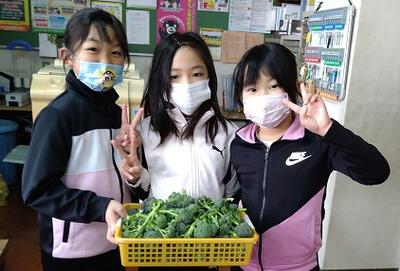 2年生のじゅなさん、あんささん、のあさんの3人が朝から職員室に畑で収穫したブロッコリーを持ってきてくれました。緑の濃い美しい房でした。これから気温が高くなると、花が開いてしまうので、今の時期に美味しく食べたいですね。