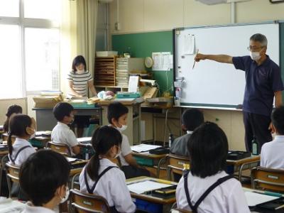 28日(木)長洲町の一先窯の山口さんをお迎えして、陶芸教室が行われました。蜜を避けるため、教室前のオープンスペースを使って、粘土をこねるところから教えて頂きました。集中して取り組む6年生に山口さんも感心しておられました。