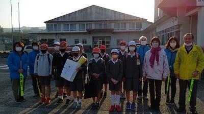 最後に皆さんと記念撮影をしました。今日は水本先生も登校見守りに来ていただいたので、撮影に参加していただきました。
