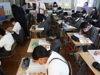 愛鳥週間のポスターを図鑑を見ながら丁寧に取り組んでいました。画材に悩んだら先生と相談です。