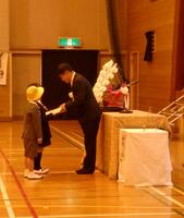 お祝いの記念品をいただきました。いただいた黄色帽子をかぶり安全に登下校をし、教科書を使ってたくさん勉強します。