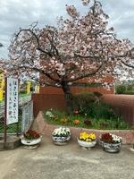 校門横の桜はしっかりと咲誇り、昇降口までのアプローチには花が