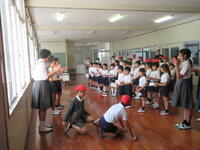 今日、持久走大会を天水中学校運動場周辺コースで行いました。低学年が約1㎞、中学年が約1.5㎞、高学年が約2㎞走りました。全員が自己ベスト目指し最後まで走り切りました。この大会の準備では、天水中学校の先生、生徒の皆さん、PTA役員の皆さんに大変お世話になりました。