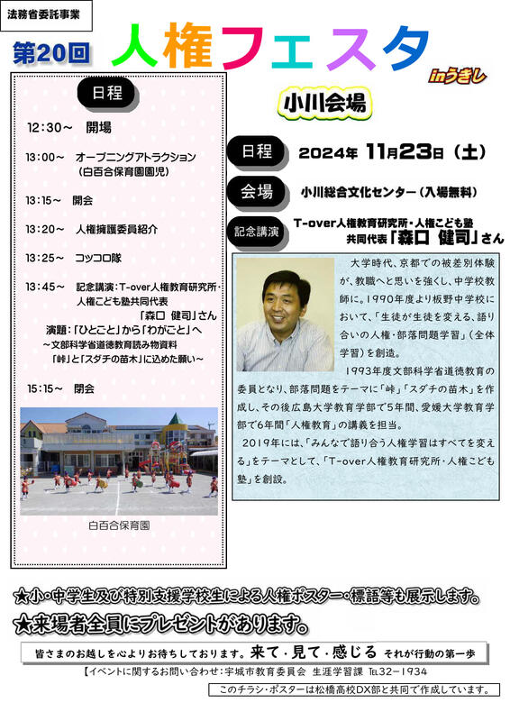 今年度は人権フェスタ20回目の年であり、記念講演と小中学生や特別支援学校生による人権作品展示のほか園児、児童、生徒によるステージ発表が予定されているそうです。