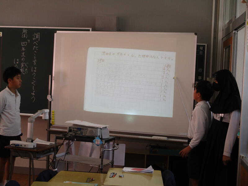 4年生の国語では「調べたことをほうこくしよう」という単元に取り組んでいます。まずはふだんの生活で気になっていることをアンケートで調べます。その結果を基に、分かりやすく伝えるとはどういうものか学習していきます。