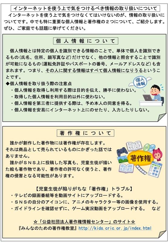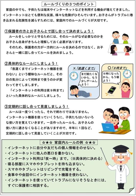 夏休みに入り、スマートフォン等を使用する機会も増えているように想像します。少しの油断や判断ミスによって、トラブル等に巻き込まれることがないよう、資料をご一読いただき、お子様とのルールづくりに生かしていただくと幸いです。