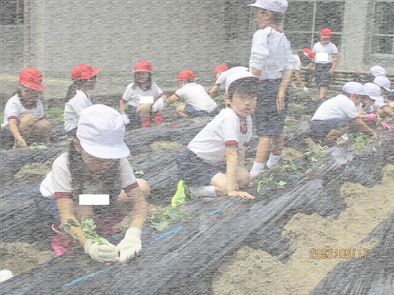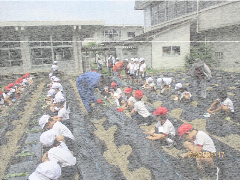 17日(水)に、生活科の学習で、芋の苗を植えました。芋が大きく育つように、子供たちはゲストティーチャーの方からの植え方の説明をしっかりと聞き、夢中になって何本も苗を植えていました。