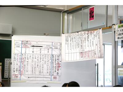 小川小学校からは、2年生が代表として国語「ニャーゴ」の授業を行いました。たくさんの先生に囲まれて緊張する中でも、教科書から自分の考えの根拠を見つけ、堂々と発表することができました。