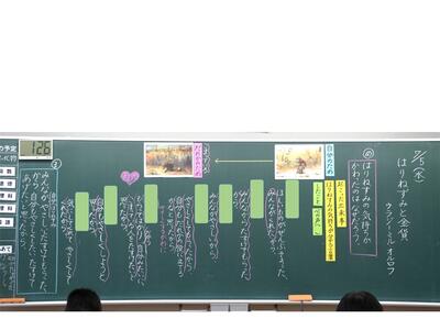 国語の物語教材「はりねずみと金貨」を扱い、金貨を自分のために使おうとしていたはりねずみが、だれかのために役立てたいという気持ちに変化したことを考える学習でした。子供たちは本文の中から自分の考えのもとになる文を探して、グループの友達に伝えたり全体に発表したりするなど、大変意欲的に取り組んでいました。