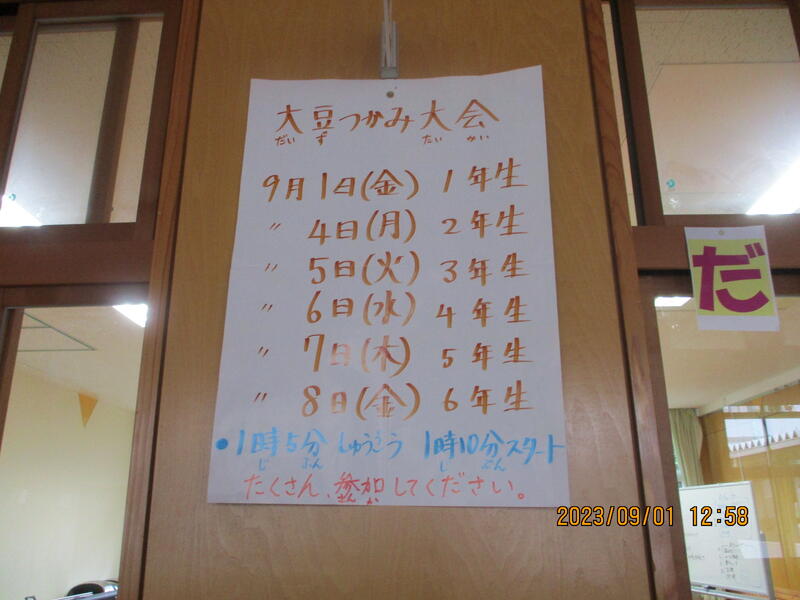 1日(金)~8日(金)の期間に、給食委員会主催で「大豆つかみ大会」が行われました。食育の一環として、箸の持ち方を学ぶために行います。つるつると滑る大豆に苦戦しながらも、一つひとつ上手に箸で掴んでいました。最高記録は、30秒で18個でした。