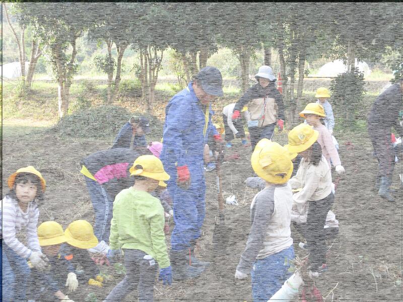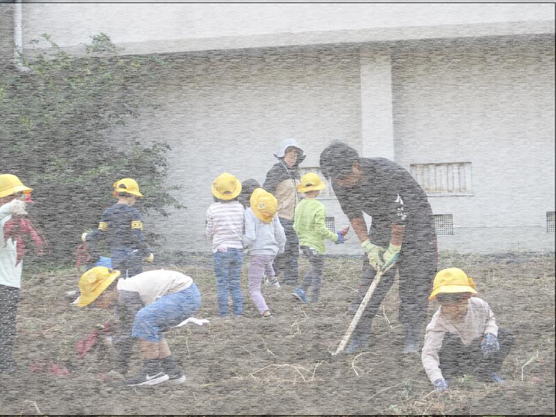 夏休みには、雑草がものすごく伸びてしまい、きちんと育っているか心配されましたが、立派に育ったたくさんのイモが収穫できました。子供たちは、大きなイモを取るために、手で一生懸命に土を掘り、勢い余って尻もちをついて泥だらけになりながら頑張って掘り出していました。