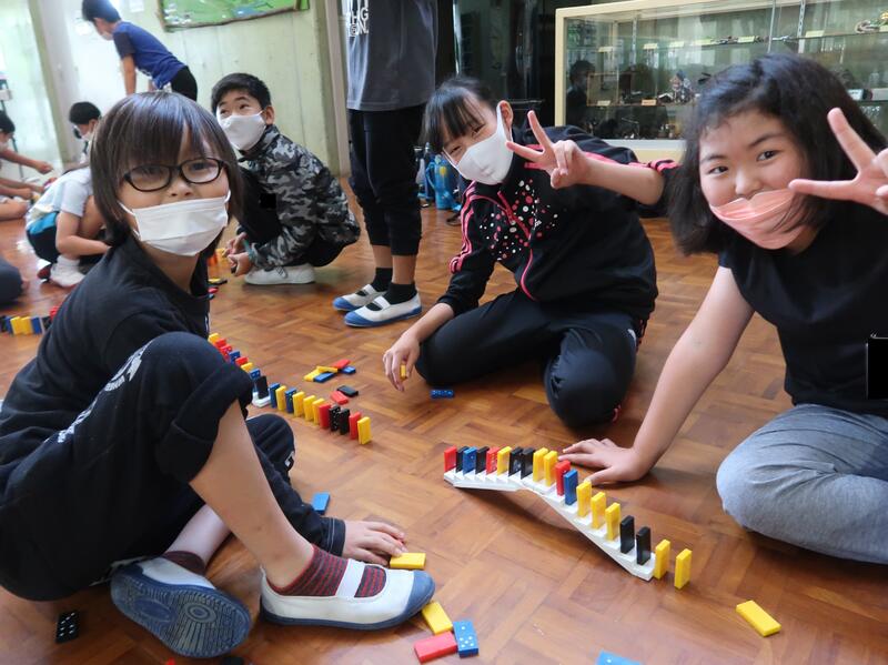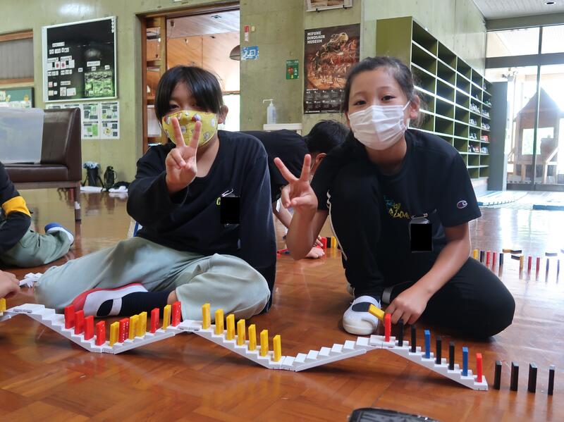 同日に宿泊した宇土東小学校の児童と交流をしました。普段学校でできないスリッパ飛ばしや空き缶積み、フロア全体を使ってドミノ並べをしました。宇土東小学校の児童とすぐに仲良くなることができました。
