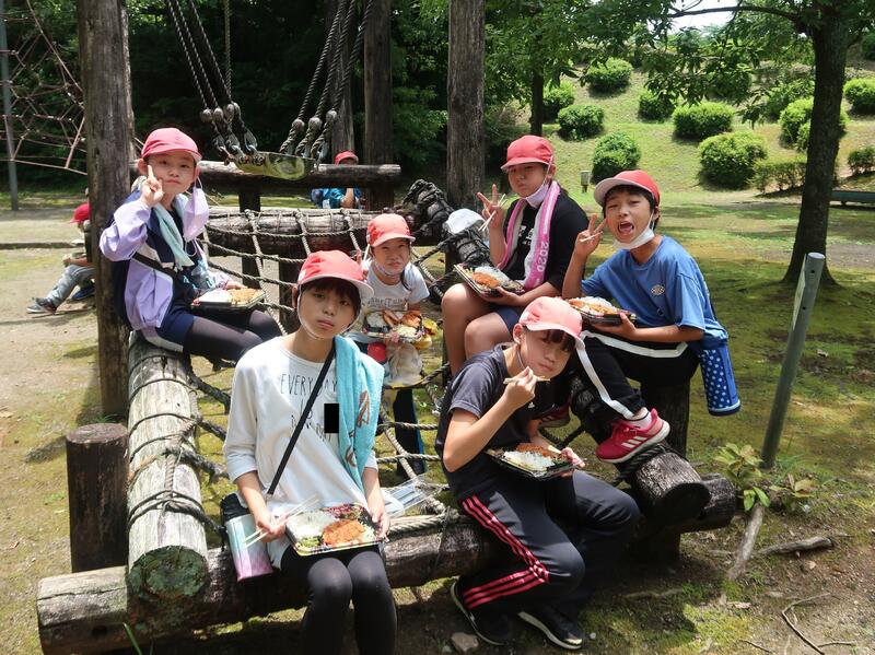 一日目の昼食は、アスレチック場で弁当を食べました。中身は豪華なカツです。ひっくり返さないように慎重に食べていました。