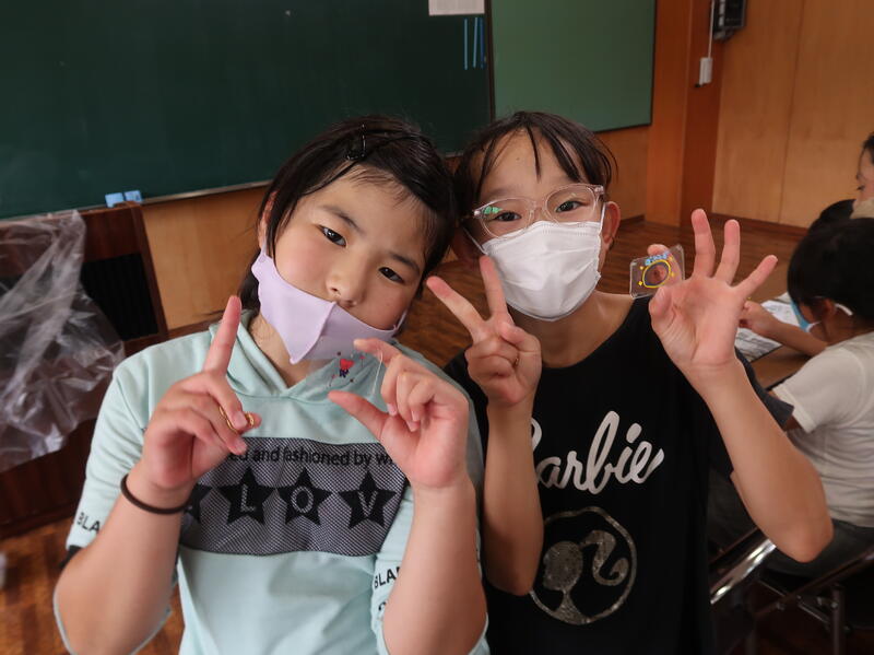 最後の活動は、プラスチックの板に絵を描いて、キーホルダーを作りました。オーブンで温めると縮んでいくプラ板を不思議そうに見つめていました。