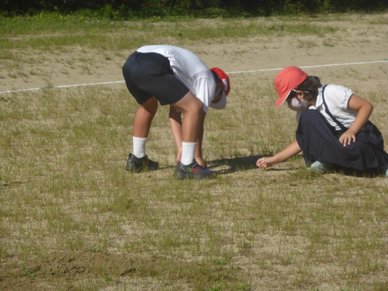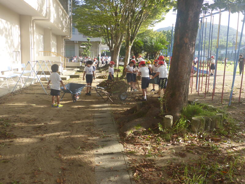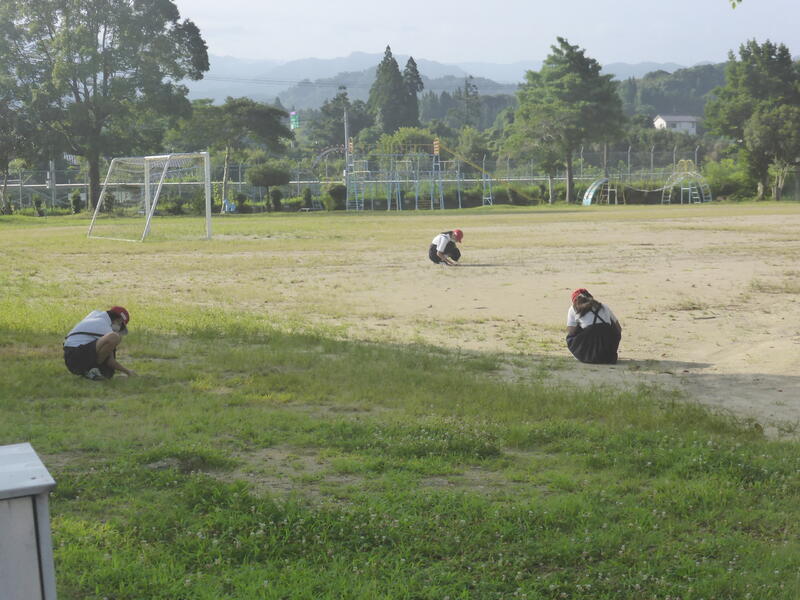 被害がなかった小川小ですが、校庭には強風による木の枝や落ち葉が散乱していました。1年から6年まで動いている友達を見て、みんなが動き出し、集めていました。