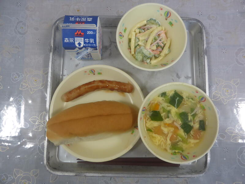 週1回のパンの日。セルフドッグ、トマトと卵のスープ、マカロニサラダです。